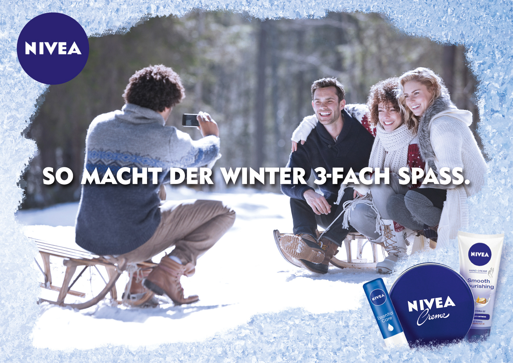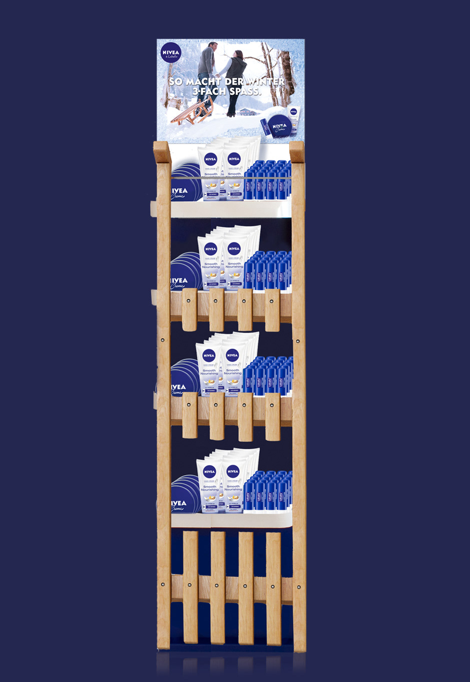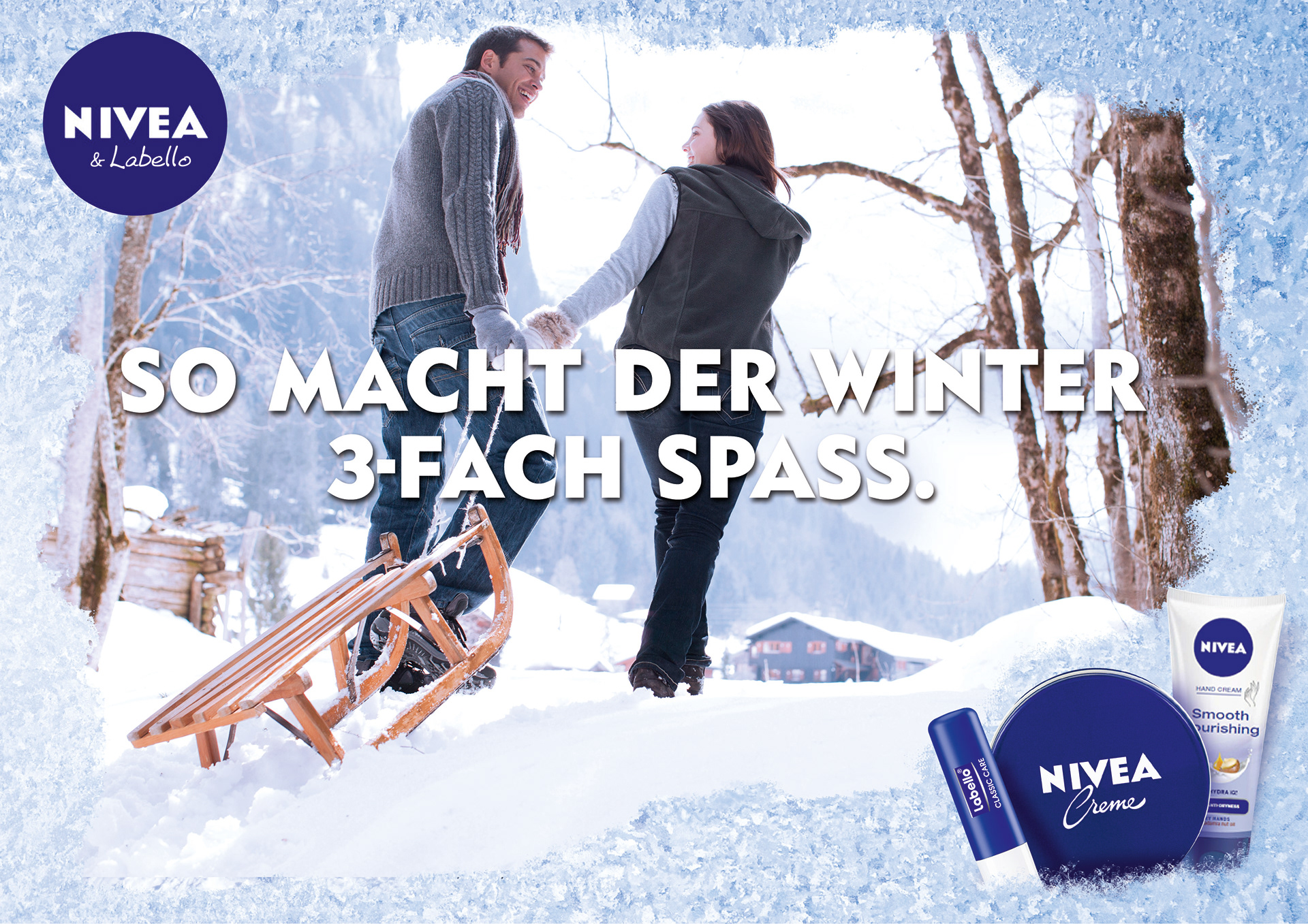 Konzept und Layout für eine globale Verkaufsförderungsaktion am POS zum Thema „Winter“ Produkte: Handcreme, Creme (Dose) und Lipstick oder Labello.