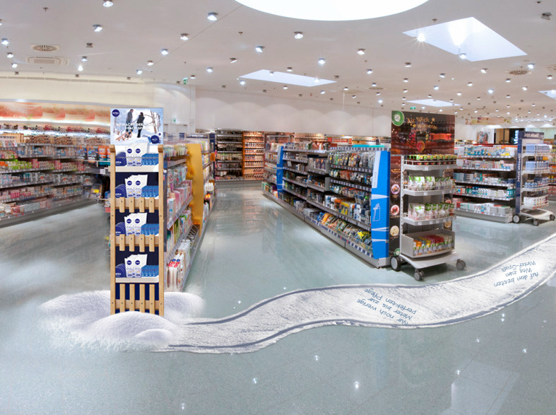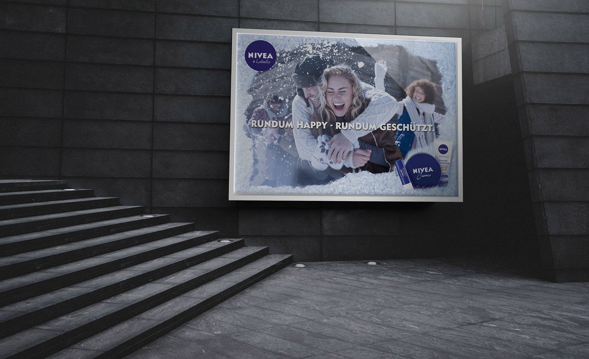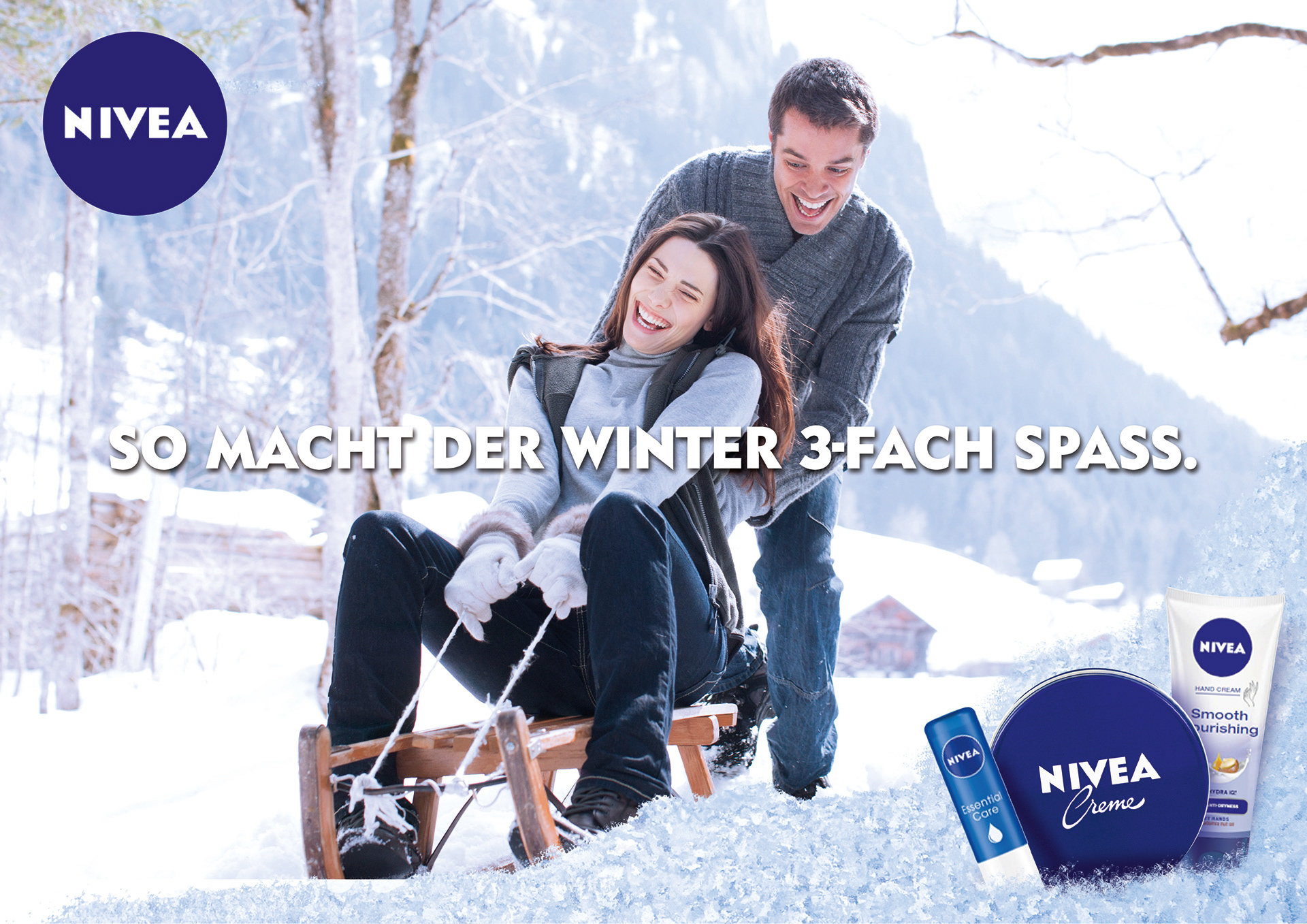 Konzept und Layout für eine globale Verkaufsförderungsaktion am POS zum Thema „Winter“ Produkte: Handcreme, Creme (Dose) und Lipstick oder Labello.